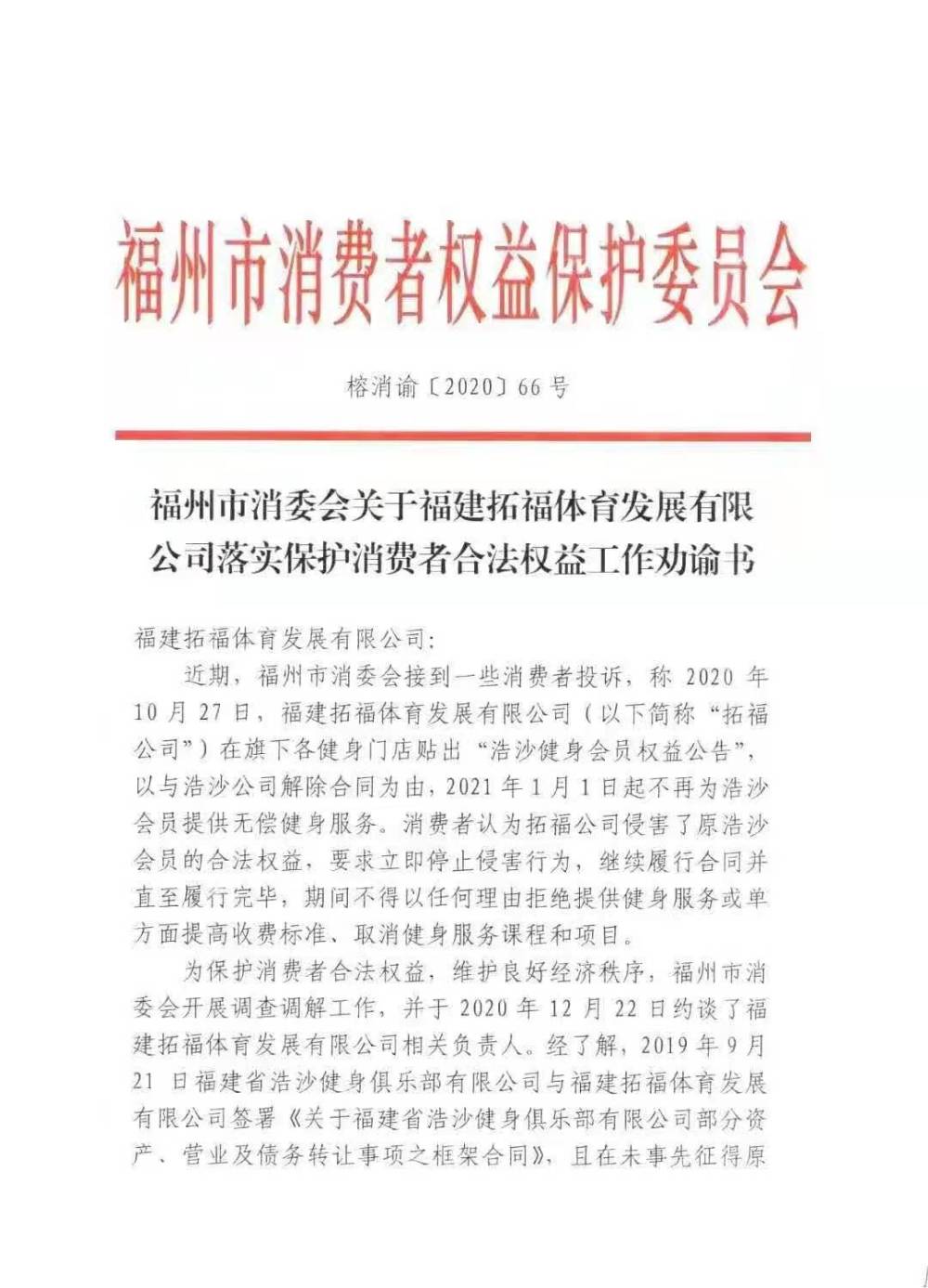 2020年12月22日,福州市消委会约谈拓福体育,指出拓福单方面行为侵害了消费者合法权益,应立即纠正,并在12月24日向拓福公司发出《落实保护消费者合法权益工作劝谕书》。在调解无果后,福州市消委会秘书长吴波表示,消委会将采取诉讼等进一步措施来维护消费者的权益。