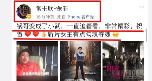 14日,《余罪》的原作者常书欣在微博上发文否认被《阳光之下》抄袭,称:“锅哥变成了小武,一直追着看,非常精彩,祝贺!新片女主有点勾魂夺魂”,从文中可见,常书欣从侧面否认了《阳光之下》的抄袭传闻。