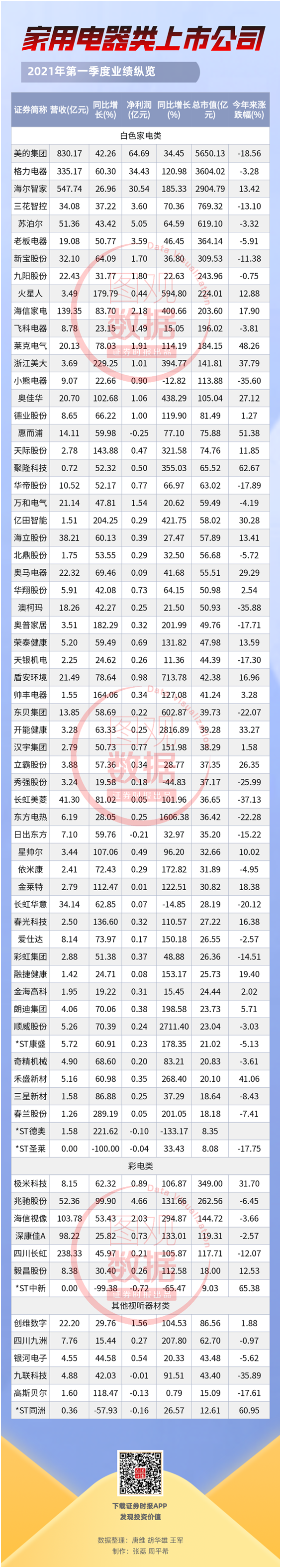 2021年一季度,国内家用电器上市公司业绩同比现恢复性增长,不少公司营收和利润同比翻倍,这里面有去年同期新冠疫情爆发,导致去年同期基数低的因素。