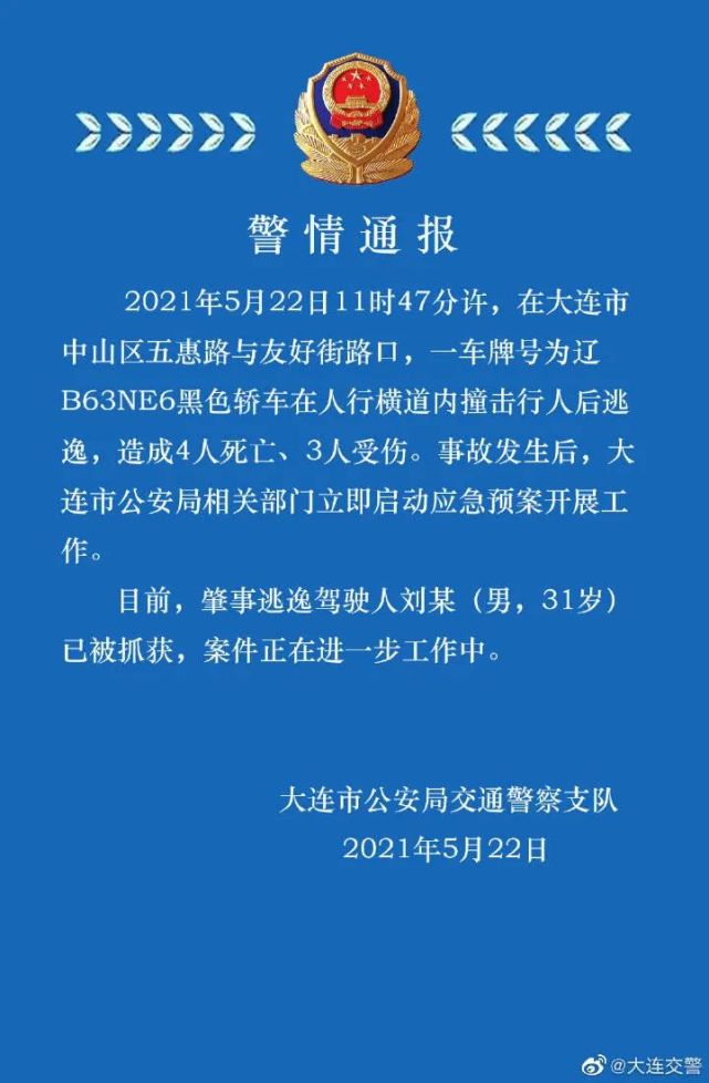 5月22日,大连市公安局交通警察支队发布通报称,2021年5月22日11时47分许,在大连市中山区五惠路与友好街路口,一车牌号为辽B63NE6黑色轿车在人行横道内撞击行人后逃逸,造成4人死亡、3人受伤。事故发生后,大连市公安局相关部门立即启动应急预案开展工作。目前,肇事逃逸驾驶人刘某(男,31岁)已被抓获,案件正在进一步工作中。