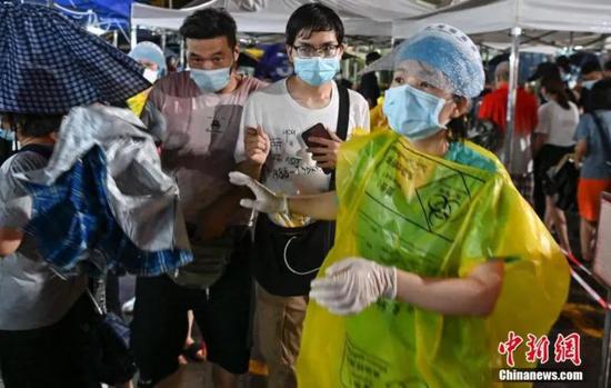5月30日晚,广东省广州市天河区万佳服装批发广场临时核酸检测点 ,身着自制雨衣的中山大学附属第三医院医护人员引导民众进行核酸检测 图/中新网