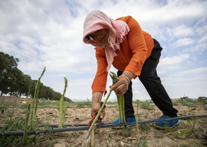 农户在宁夏吴忠市同心县下马关镇窖坑子村芦笋种植基地采摘芦笋(6月23日摄)。 近日,宁夏吴忠市同心县下马关镇窖坑子村的旱地芦笋进入收获期,工作人员加紧采收,供应市场。