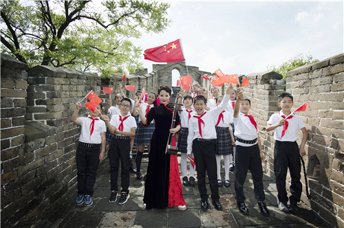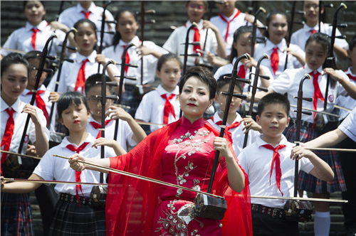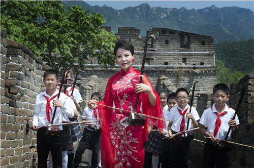 6月27日,中国著名胡琴演奏家胡艺影携手19名北京中小学生,登上慕田峪长城,20人协作演绎了经典歌曲《我和我的祖国》。