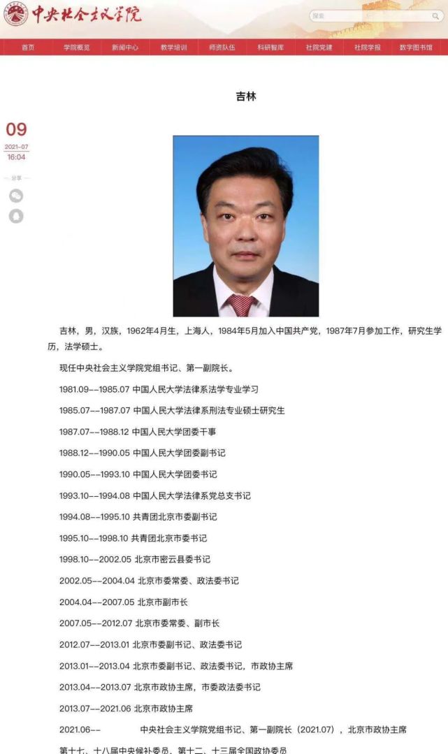 中央社会主义学院官网信息显示,北京市政协主席吉林已任中央社会主义学院党组书记、第一副院长。