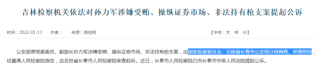 最高检披露的消息显示,该案是由国家监察委员会、吉林省长春市公安局分别调查、侦查终结,经最高人民检察院指定,由吉林省长春市人民检察院审查起诉的。