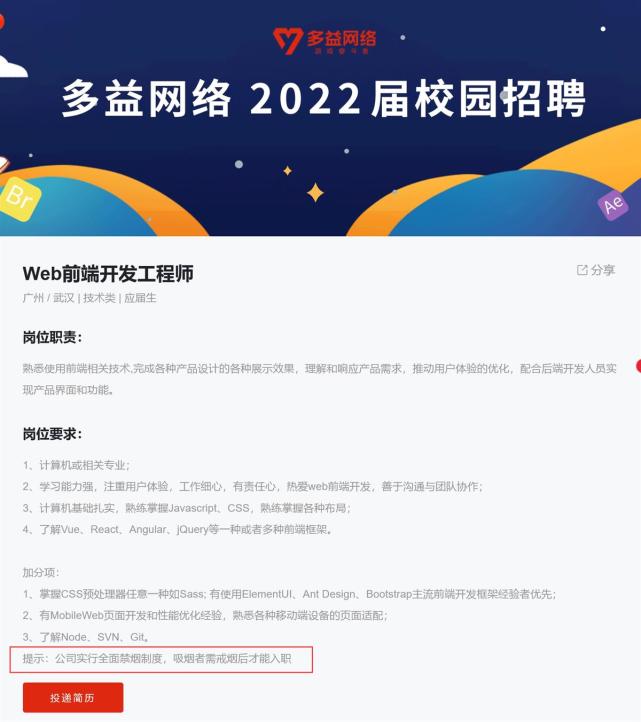 上述引发争议的相关招聘要求,出现在广州某公司的官网及招聘网站上该公司的招聘信息中。该公司官网“Web前端开发工程师”“美术设计师”“产品策划”等不同岗位的招聘信息中,岗位要求一栏均提示称,“公司实行全面禁烟制度,吸烟者需戒烟后才能入职。”记者注意到,在某招聘网站上,该公司的招聘岗位也有类似的要求。有媒体消息称,该公司招聘岗位1000余个,基本每条招聘信息尾部都有入职戒烟的提示。