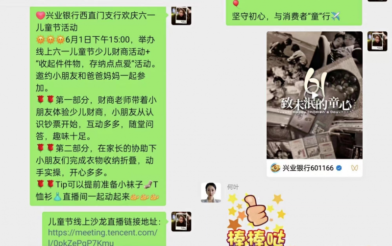 在“六一”国际儿童节之际,兴业银行北京分行组织辖内各网点开展线上“六一”专辑——《少儿财商教育》活动。据介绍,该活动采用群互动、小视频、直播等多种形式,通过多样的形式有效地帮助青少年了解货币的发展历程,寓教于乐。