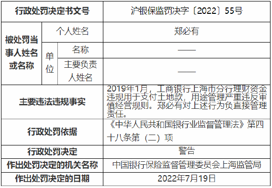 此外,还有1名相关责任收到罚单。具体来看,2019年1月,工商银行上海市分行理财资金违规用于支付土地款,用途管理严重违反审慎经营规则,该行相关负责人郑必有对此负直接管理责任,为此上海银保监局对其作出警告的处罚决定。