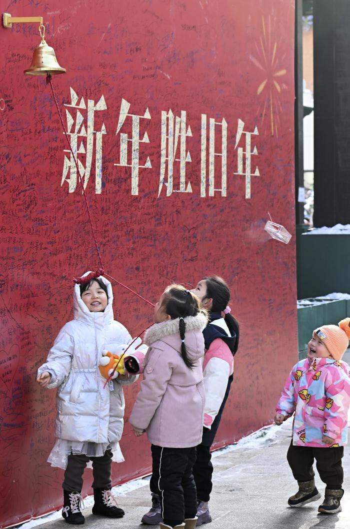 2026年1月1日,在乌鲁木齐大巴扎步行街疆来城,小朋友拉动绳索敲响新年钟声。