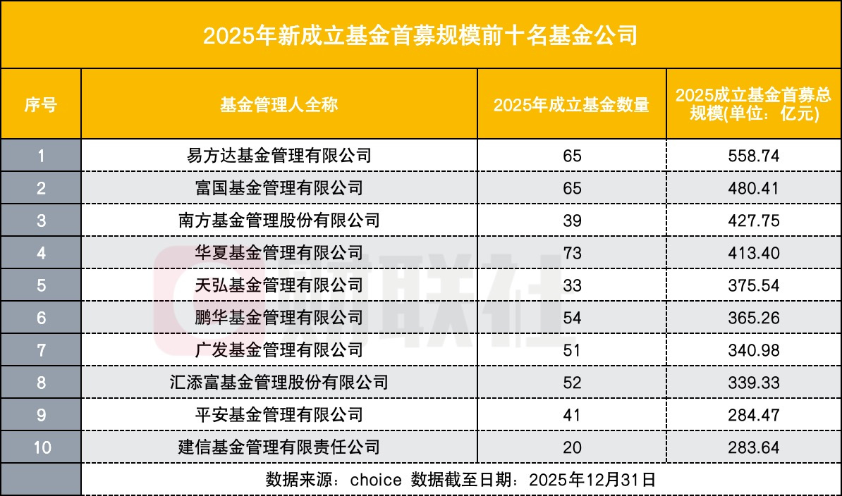 其中,2025年成立基金的首次募资总规模最多的基金公司为易方达基金。2025年全年,该公司共有65只新基金成立,总募资规模达558.74亿元。易方达基金也是唯一一家在2025年实现新成立基金募资总规模超过500亿的公募基金公司。