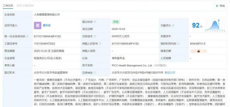 公开资料显示,早在2015年,中国人保高层便在业绩发布会上透露了成立单独健康管理公司的规划。2021年,人保健康便启动健康管理公司的筹建规划。2025年8月20日,国家金融监督管理总局正式批复人保健康出资2亿元设立全资子公司,持股比例100%。同年9月17日,人保健管完成设立登记,注册资本2亿元。