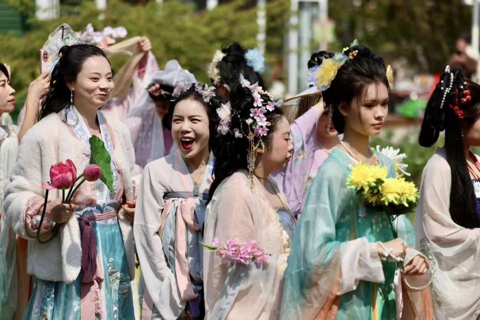 活动期间,十二花神巡游、近百场传统文化节目轮番上演,70位汉服爱好者竞逐“十二花神”,汉风市集、国风运动会、非遗体验等趣味十足。