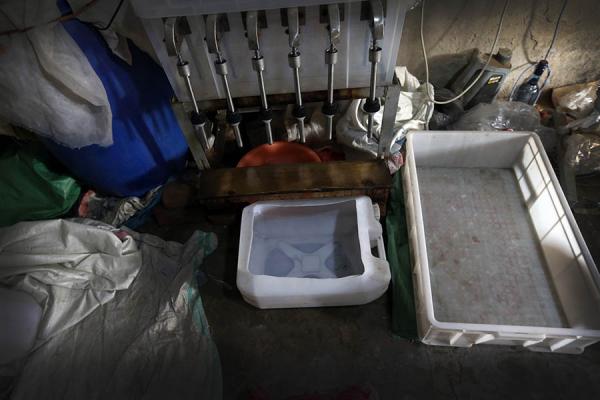 走进平房内,数十桶撒装白酒摆放在墙边,等待“变身”成品牌白酒。而这个“变身”的过程却十分简单:简单过滤,一人用机器将散白酒灌进从废品收购站收来的酒瓶中,一人压盖,一人贴标、装箱。20秒,一瓶假冒低端品牌白酒就“生产”完成了。