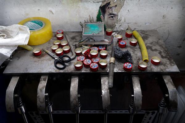 制假窝点卫生条件很差,酒瓶盖随意摆放在肮脏的工作台上。