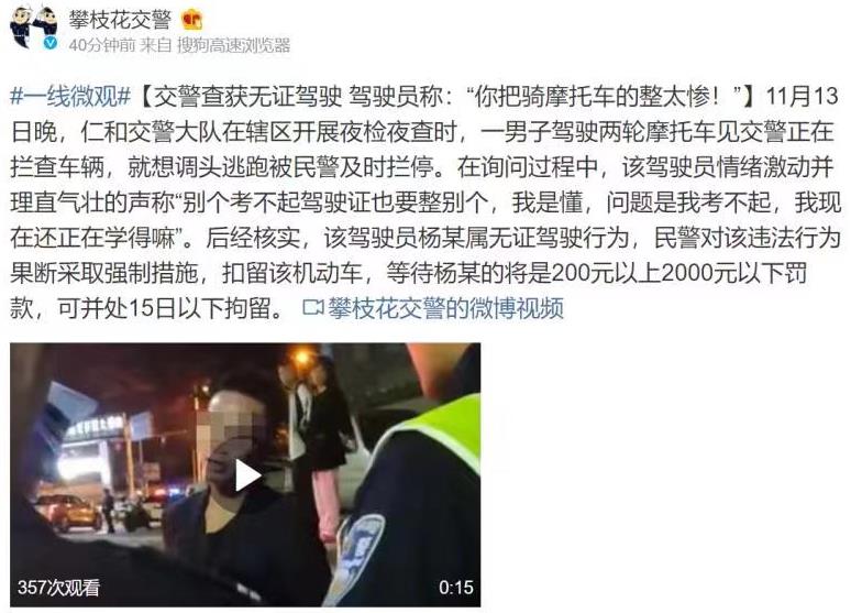 据攀枝花交警11月18日通报称,11月13日晚,仁和交警大队在辖区开展夜检夜查时,一男子驾驶两轮摩托车见交警正在拦查车辆,就想调头逃跑,被民警及时拦停。在询问过程中,该驾驶员情绪激动并理直气壮地声称:“别个考不起驾驶证也要整别个,我是懂,问题是我考不起,我现在还正在学得嘛”。后经核实,该驾驶员杨某属无证驾驶行为,民警对该违法行为果断采取强制措施,扣留该机动车,等待杨某的将是200元以上2000元以下罚款,可并处15日以下拘留。