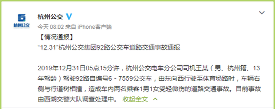 情况通报称,12月31日早上5点15分许,杭州公交电车分公司司机王某(男、杭州籍、13年驾龄)驾驶92路自编号6—7559公交车,由东向西行驶至体育场路时,车辆右侧与行道树相撞,造成车内两名乘客1男1女受轻微伤的道路交通事故。目前事故由西湖交警大队调查处理中。
