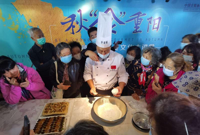 说到节气与节日,自然离不开美食,什么节吃什么,都是有讲究的。全聚德和平门店大厨特别为大家准备了重阳糕,并现场教授重阳糕的制作方法与技巧。在场的观众更是化身“好学生”,有的拍照、有的录像,也有的拿笔记录着关键点。“重阳糕就是在重阳节吃的一种节令食品,就如同清明节吃青团,中秋节吃月饼一样,是一种特别应景的食物,也借此机会祝愿老人们节日快乐,身体安康。”全聚德和平门店的大厨表示,考虑到季节因素,此次制作的重阳糕特别添加了南瓜蓉作为养生食材,希望现场观众能吃得更加健康。