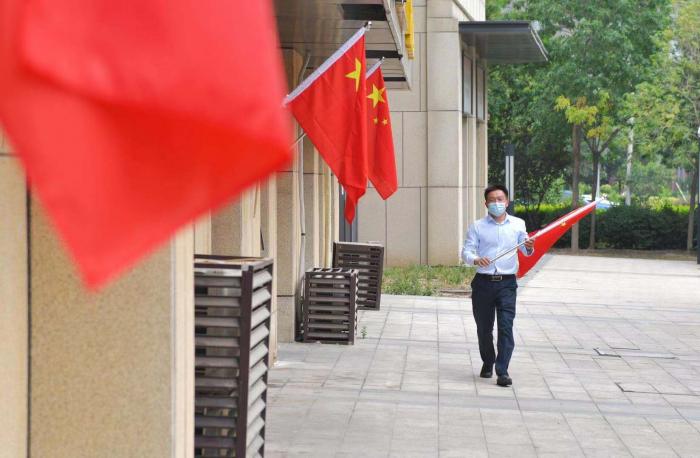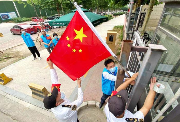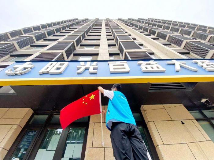 据金茂悦社区党支部副书记王蕊介绍,社区内所有国旗的悬挂都是社区自愿者完成的。