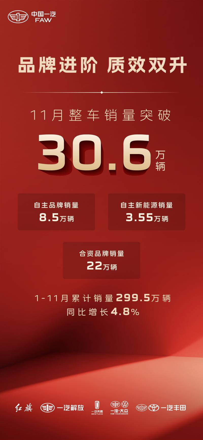 12月1日,中国一汽发布销量数据。2025年11月,中国一汽销售整车30.6万辆。其中,自主品牌销量8.5万辆;自主新能源汽车销量3.55万辆,继续保持高速增长态势;合资品牌销量22万辆,持续巩固市场领先地位。1-11月累计销售299.5万辆,同比增长4.8%,经营质量持续提升。其中,自主品牌新能源增速显著;节能车逆势增长,销量增幅明显。中国一汽坚持以科技创新为引领,深入推进“稳中快进、创新提质”总体策略,在品牌向上、技术突破、市场开拓等方面取得多项重要进展,企业高质量发展迈上新台阶。