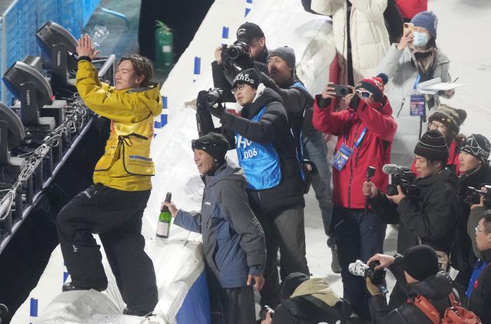 苏翊鸣和教练佐藤康弘向观众致谢。