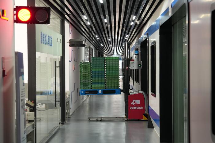 在宁波金山双鹿电池有限公司5G智慧工厂拍摄的电池智能生产车间(3月25日摄)。