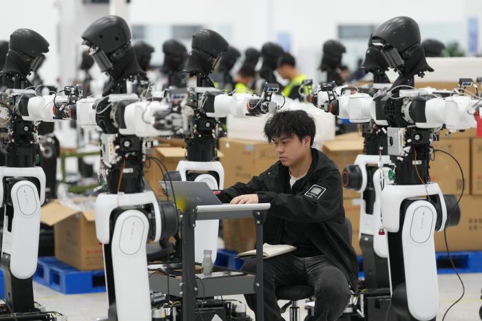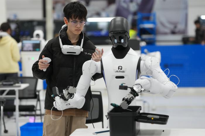 目前宁波市高新技术企业突破10050家,科技型中小企业达2.6万家,国家级单项冠军企业数量连续8年领跑全国。技术人员在宁波博登智能科技有限公司调试人形机器人(3月26日摄)。