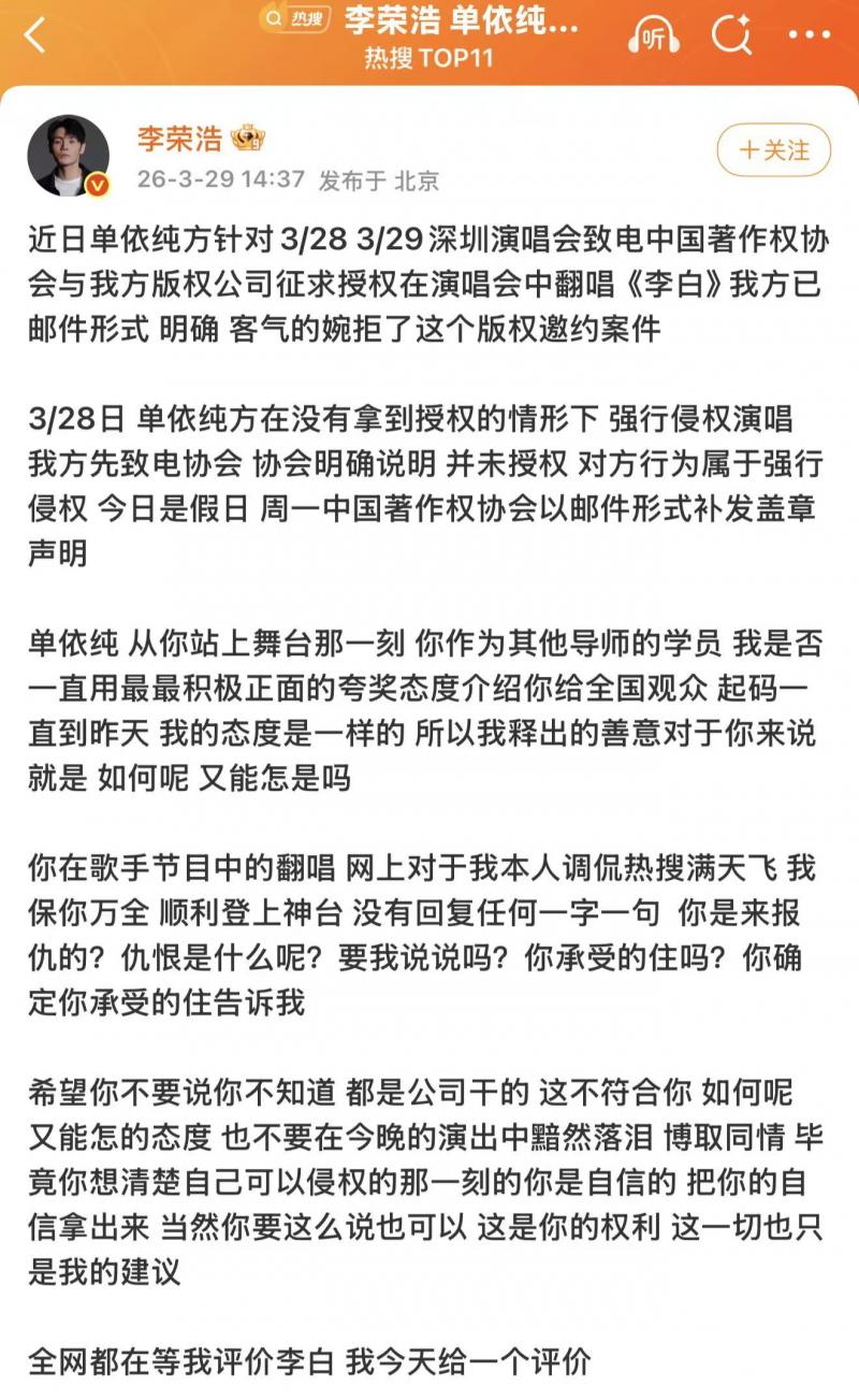 李荣浩怒批侵权,单依纯致歉回应