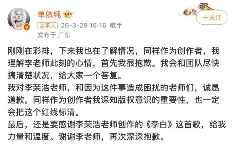 在事件引发巨大争议后,当事人单依纯在彩排结束后第一时间作出回应,向李荣浩及受事件影响的各方诚恳致歉。单依纯表示,自己刚刚在彩排,彩排结束后便立刻着手了解整件事情的情况,同样作为音乐创作者,她十分理解李荣浩老师此刻的心情,首先对此深表抱歉。她承诺,会和团队尽快搞清楚状况,给公众、给李荣浩方一个明确的答复。