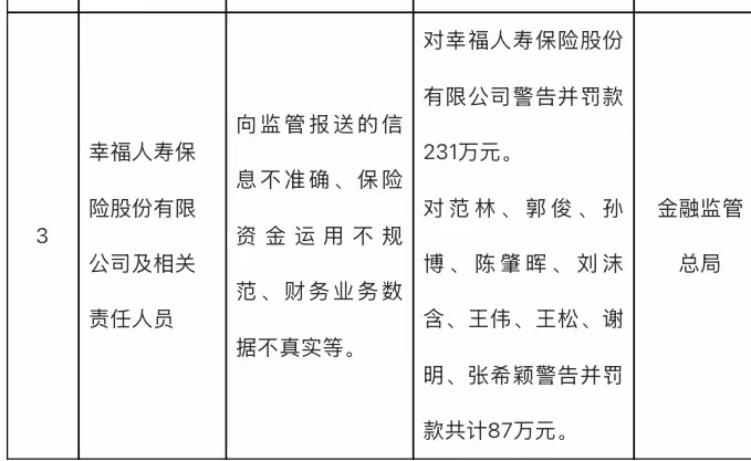 具体来看,金融监管总局对幸福人寿警告并罚款231万元,对范林、郭俊、孙博、陈肇晖、刘沫含、王伟、王松、谢明、张希颖等9名相关责任人警告并罚款共计87万元。