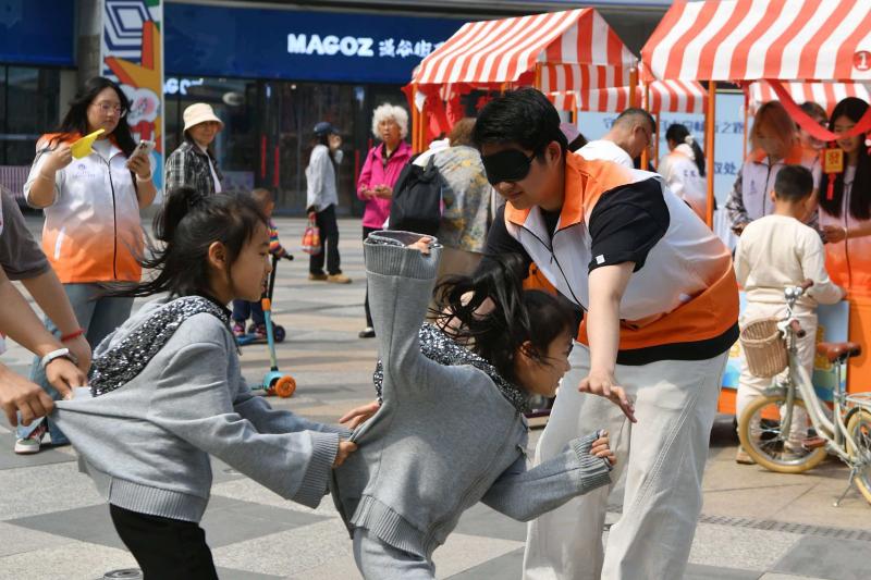 为了让公众更深入地理解视障人士的日常生活出行困境,北京农学院文法与城乡发展学院社工专业师生在体验区组织了10项沉浸式体验活动。在志愿者耐心引导下,市民通过蒙眼挑战、导盲犬知识问答等环节,亲身感受视障群体的出行不易,深刻认识到无障碍环境建设的重要意义。活动期间,青年社工学会、文发学院青年志愿者协会招募了60名学生志愿者全程服务,会展经济与管理专业师生还制作并展示了导盲犬主题文创产品,以生动鲜活的形式进一步宣传国际导盲犬日理念和无障碍知识。中国盲文图书馆则通过展览展示、互动体验、公益讲座等多种形式,面向社会公众和盲人读者群体,倡导“平等、参与、共享”的无障碍阅读理念,推动无障碍理念融入社会各个角落。