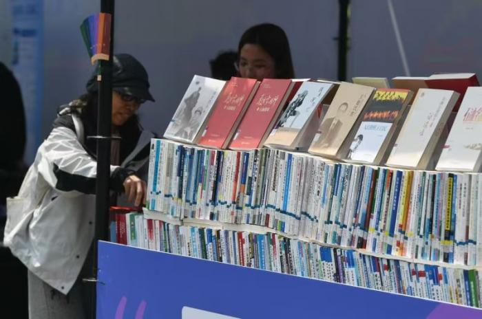 市民在书市上浏览阅读。