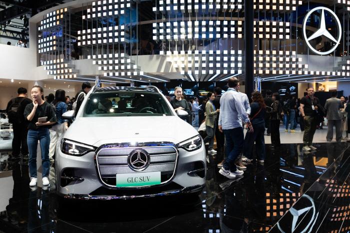 据了解,2026北京车展展车总数1451台,包含首发车181台,概念车71台。图为梅赛德斯奔驰展台