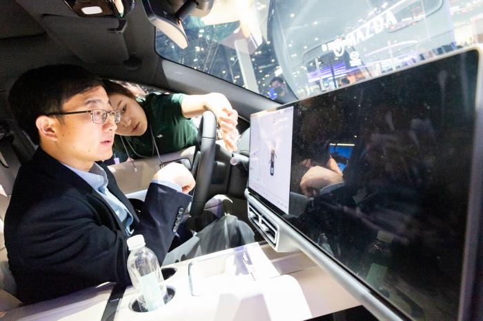 车展上,观众进入车内体验,工作人员为其讲解