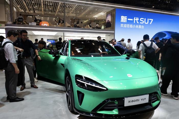 小米展台上,观众参观一辆绿色的小米YU7