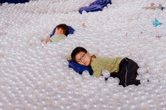 儿童馆项目“故事海”邀请了8位创作者与孩子一起编写、讲述、录制故事。他们的声音藏匿于展厅中一个圆形海洋球池内。