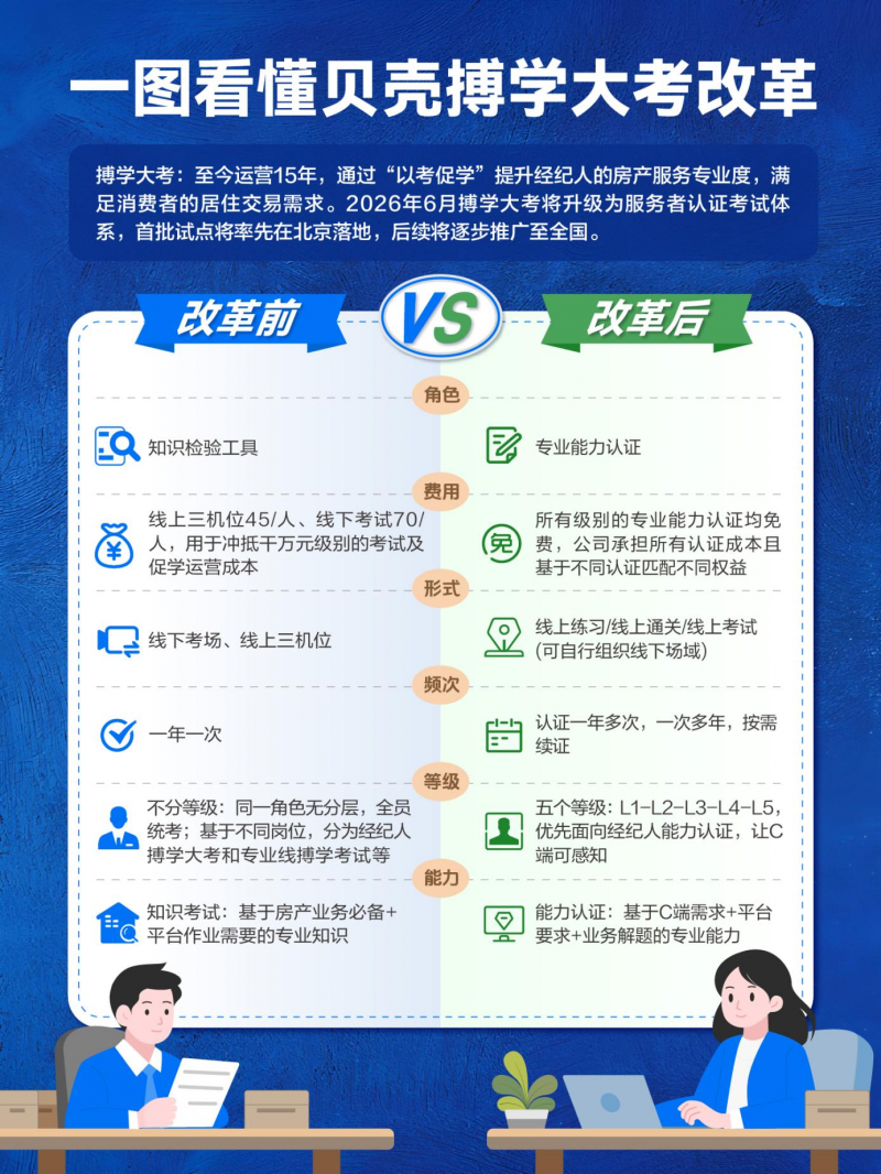 4月27日,贝壳宣布将于6月全面改革搏学大考,原搏学大考将升级为服务者认证体系。首批试点将率先在北京落地,后续将逐步推广至全国。