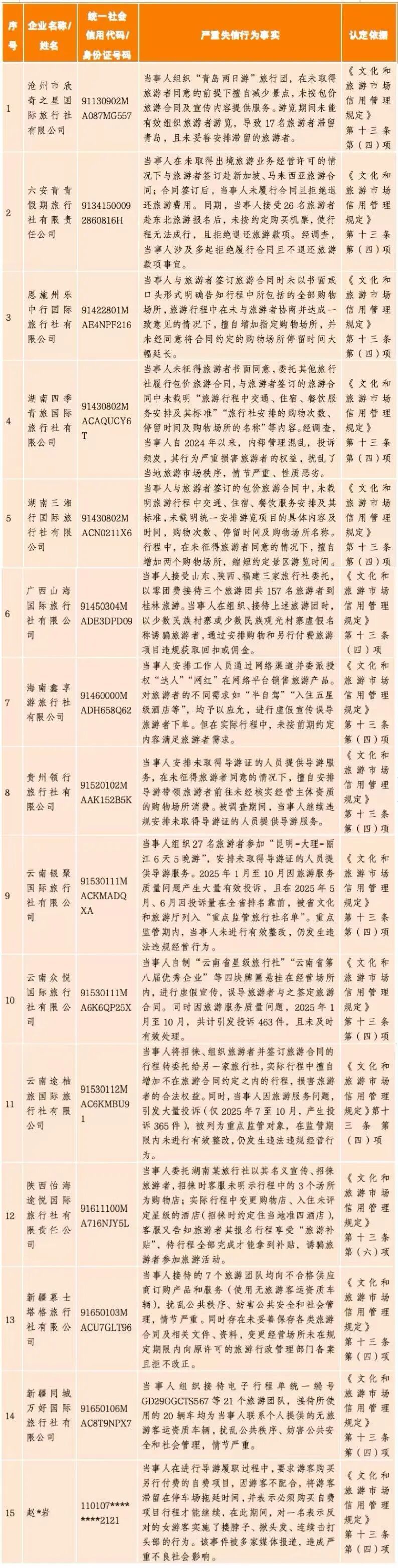 文旅部公布旅游市场秩序集中整治严重失信主体典型名单