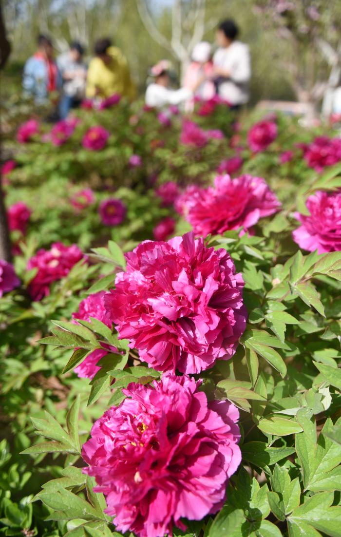 4月24日,人们在甘肃省永靖县刘家峡镇黄河花堤牡丹园里赏花游览。新华社发(史有东摄)