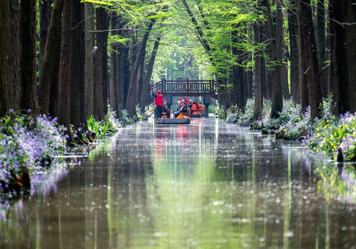 4月23日,游客乘船在江苏省兴化市李中水上森林公园赏花游玩。新华社发(杨玉岗摄)