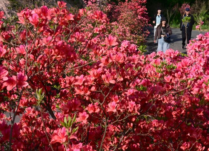 4月23日,游客在河南省汝阳县西泰山欣赏盛开的杜鹃花。新华社发(高山岳摄)