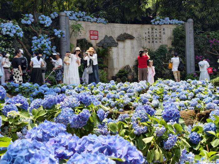 4月25日,游人在广西南宁市青秀山风景区绣球谷赏花游玩。新华社发(喻湘泉摄)