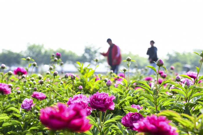4月25日,游客在河南省济源市梨林镇后荣村芍药种植基地赏花游玩。新华社发(苗秋闹摄)