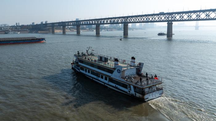 2025年12月25日,游客乘坐轮渡欣赏武汉江段风景(无人机照片)。新华社记者 肖艺九 摄