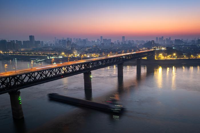 日出东方,桥面沐晨光,载着不息车流奔赴四方;暮色四合,桥身染余晖,与粼粼江景相融共生。“一桥飞架南北,天堑变通途。”这座座卧波长虹,既承载着人民美好的生活,也联通着新时代奋进的脚步。2025年12月26日,晨曦中的武汉长江大桥(无人机照片)。新华社记者 肖艺九 摄