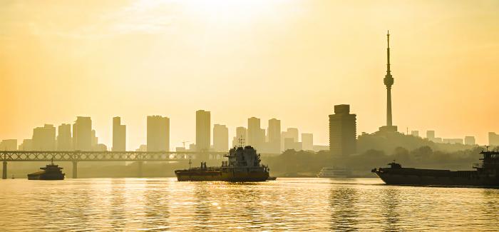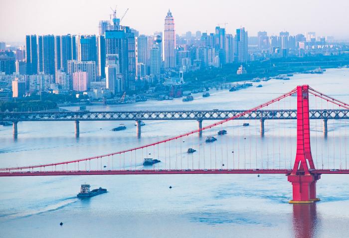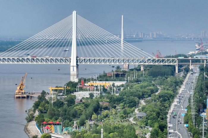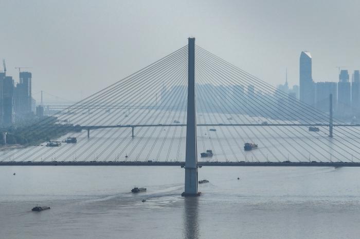 目前,在湖北1061公里长江干流上,建成与在建的长江大桥已近50座。往日耗时良久的过江行程,如今最快十几分钟即可抵达,这便利了人们的日常出行,更为区域协同发展铺就坦途。2025年7月29日,船舶行驶在长江武汉段(无人机照片)。新华社记者 肖艺九 摄