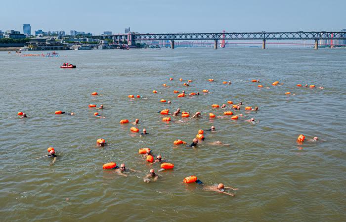 2025年7月16日,选手们横渡长江(无人机照片)。当日,第50届武汉渡江节在长江武汉段举行。新华社记者 肖艺九 摄