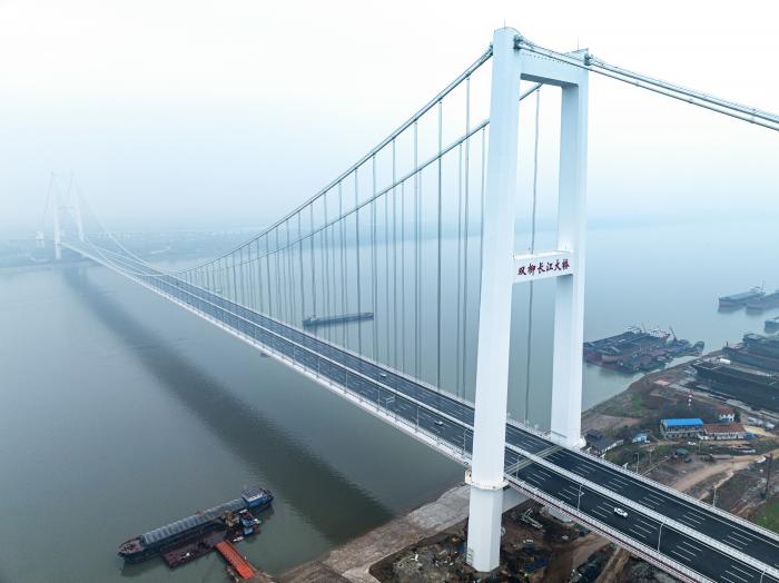 2026年3月20日,双柳长江大桥正式通车(无人机照片)。双柳长江大桥桥址下游2公里,便是长江江豚频繁出没的栖息地。为给江豚留足生存空间,大桥没有采用在江中设墩的传统方案,而是设计为“一跨过江”,所有桥墩均建在陆地。新华社记者 肖艺九 摄