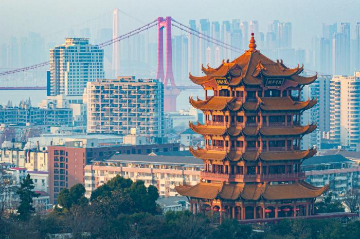 2025年12月26日拍摄的武汉黄鹤楼(无人机照片)。后方依次是鹦鹉洲长江大桥、杨泗港长江大桥。新华社记者 肖艺九 摄