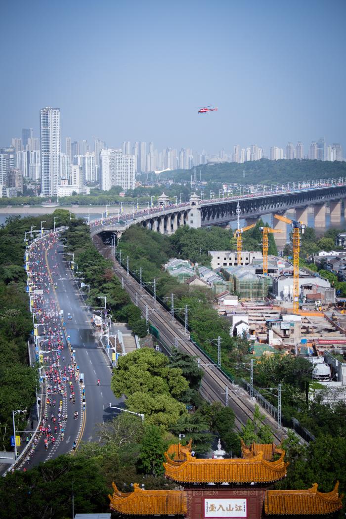 2023年4月16日,武汉马拉松参赛选手经过武汉长江大桥。新华社记者 伍志尊 摄