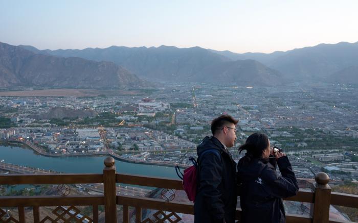 4月26日,游客在拉萨市南山公园拍摄拉萨城区风景。